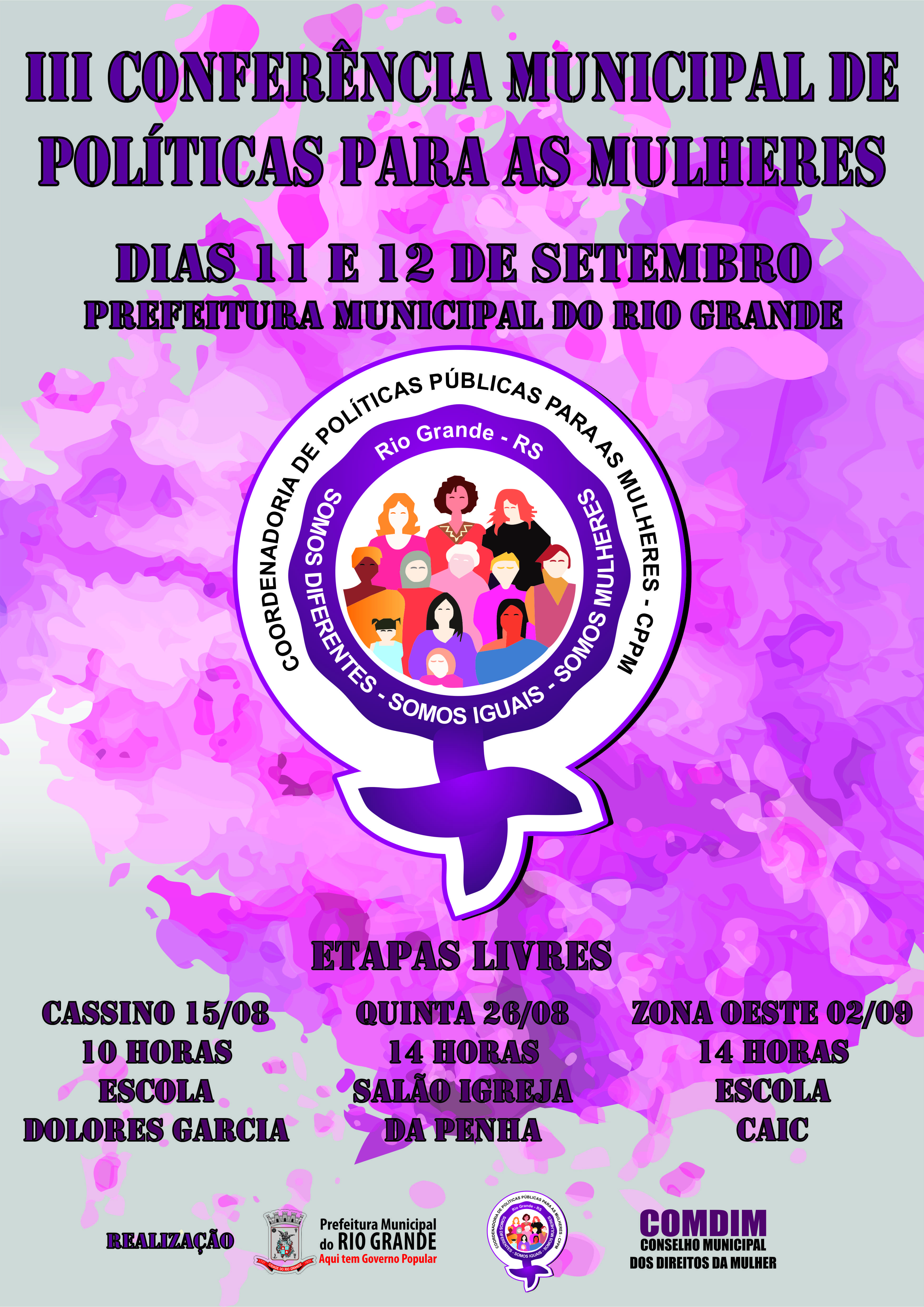A Prefeitura Municipal do Rio Grande, através da Coordenadoria de PolÃticas Públicas para as Mulheres, vem por meio deste, informar sobre a III Conferência Municipal de PolÃticas Públicas para as Mulheres que se realizará dia 11/09 a partir das 19:00 hs e dia 12/09 a partir das 08:00 hs, no Salão Nobre da Prefeitura Municipal do Rio Grande.