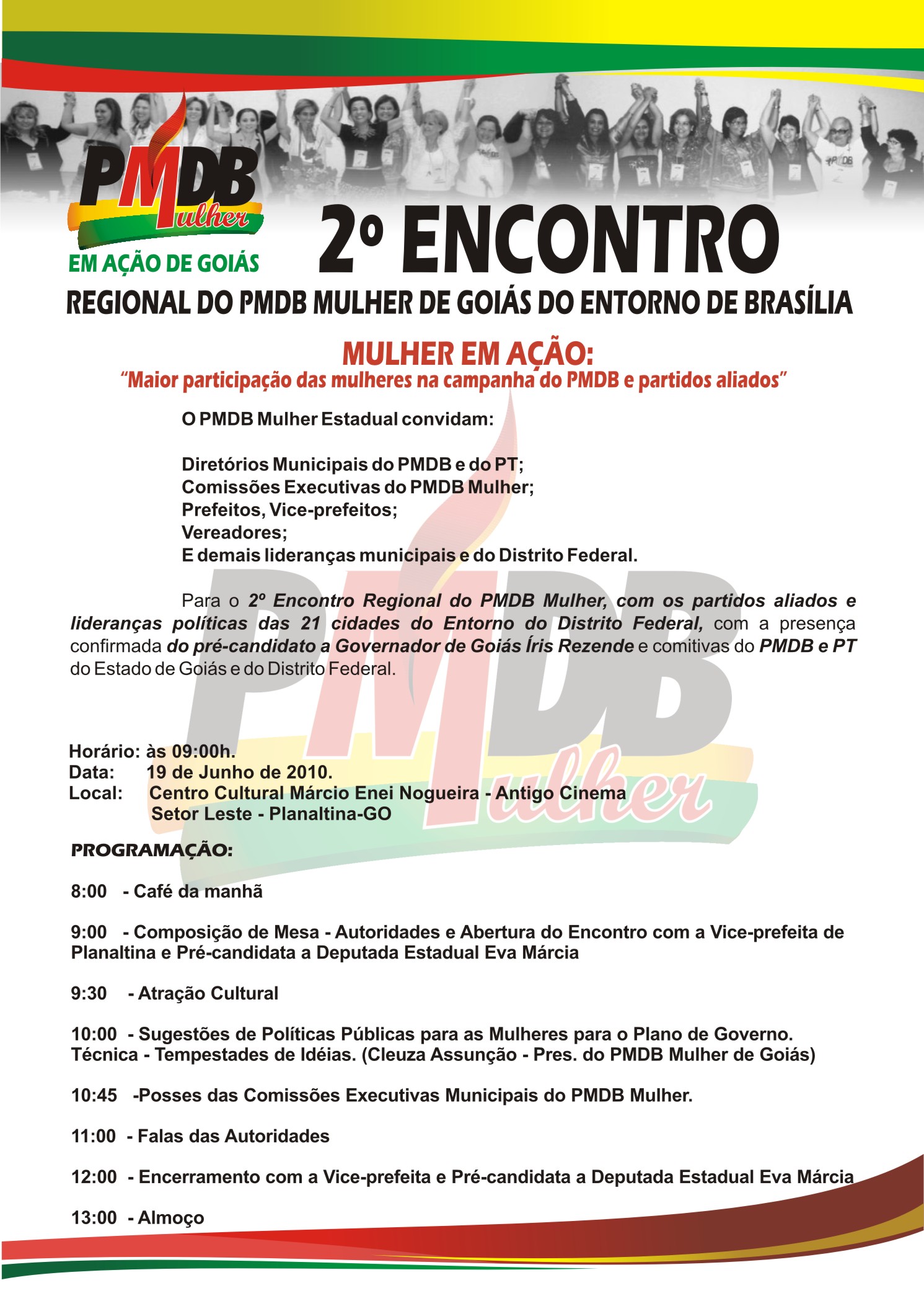 [ForumCoordenadorias] FW: CONVITE URGENTE DIA 19/05/2010 2° Encontro Regional do PMDB MULHER de Goiás do Entorno de Brasília