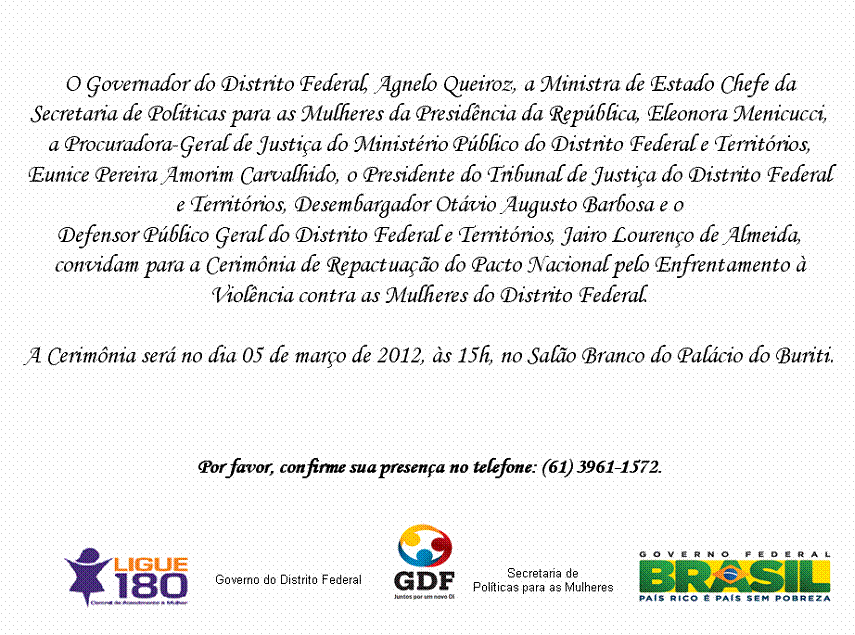 [ForumCoordenadorias] CONVITE - CERIMÔNIA DE REPACTUAÇÃO DO PACTO NACIONAL PELO ENFRENTAMENTO À VIOLÊNCIA CONTRA AS MULHERES DO DISTRITO FEDERAL