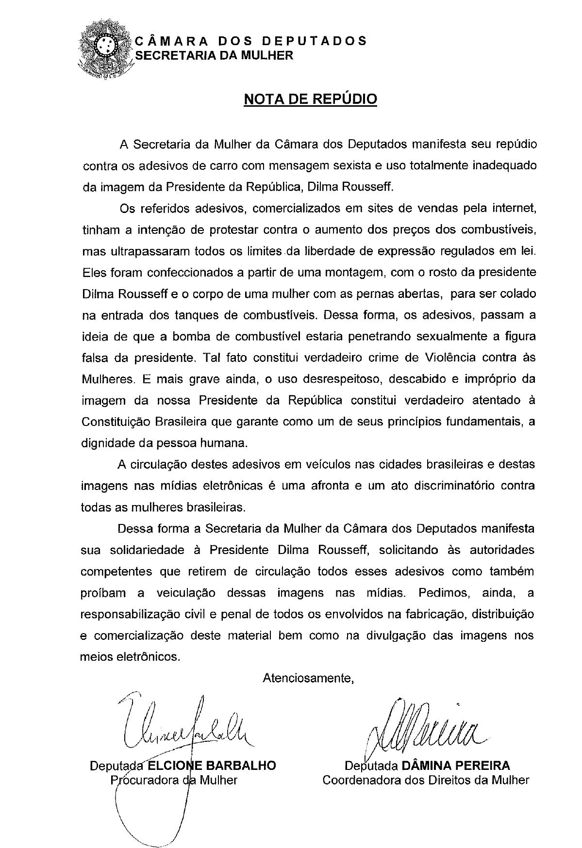 Re: [Mulheresdepartidos] Nota de Repúdio da Secretaria da Mulher da Câmara dos Deputados