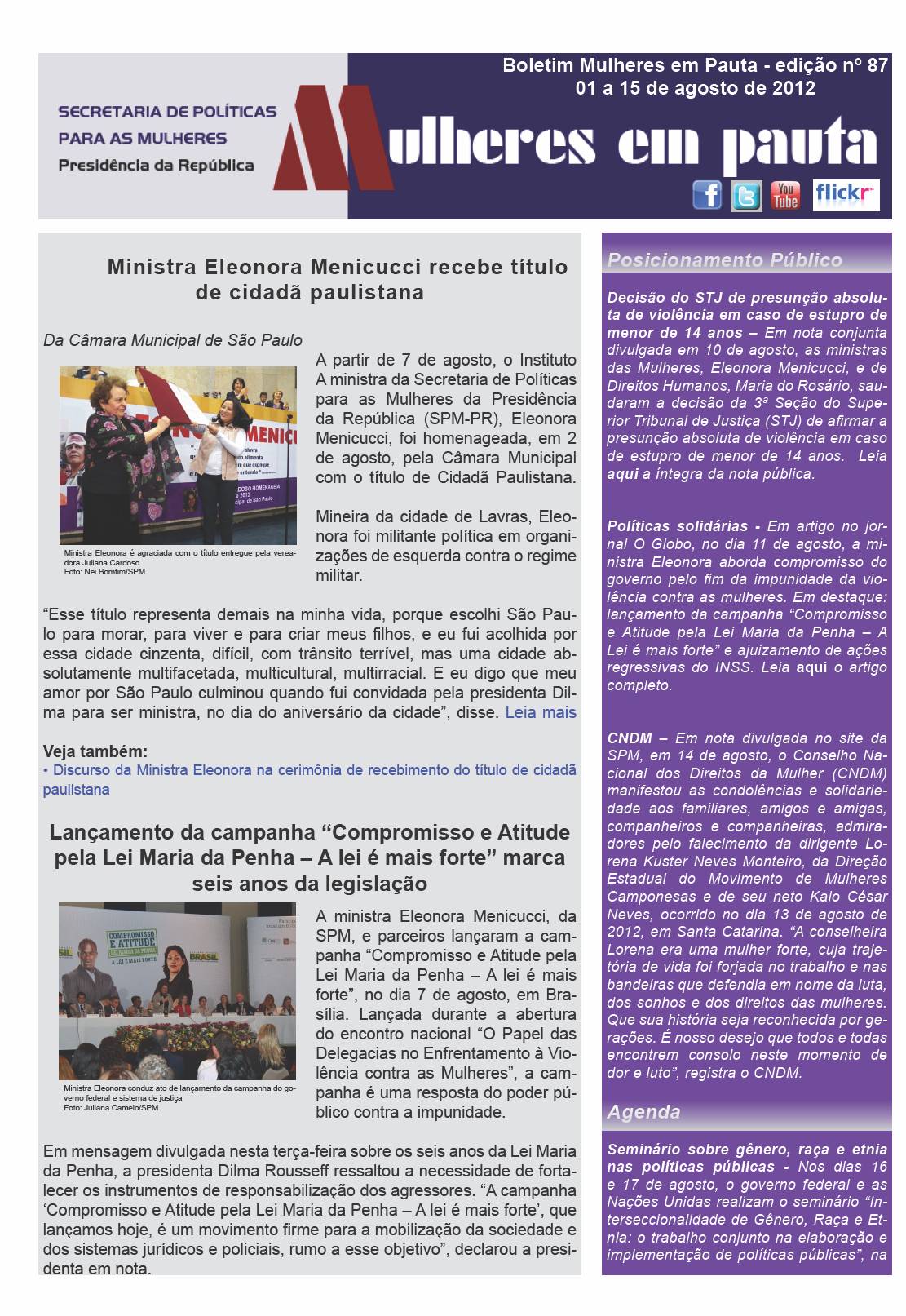 [Pactonacional] ENC: Boletim SPM/PR - Mulheres em Pauta nº 87 - 01 a 15 de agosto de 2012
