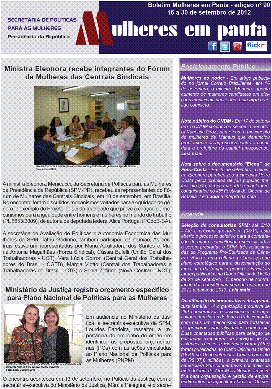 [Pactonacional] ENC: Boletim SPM/PR - Mulheres em Pauta nº 90 - 16 a 30 de setembro de 2012