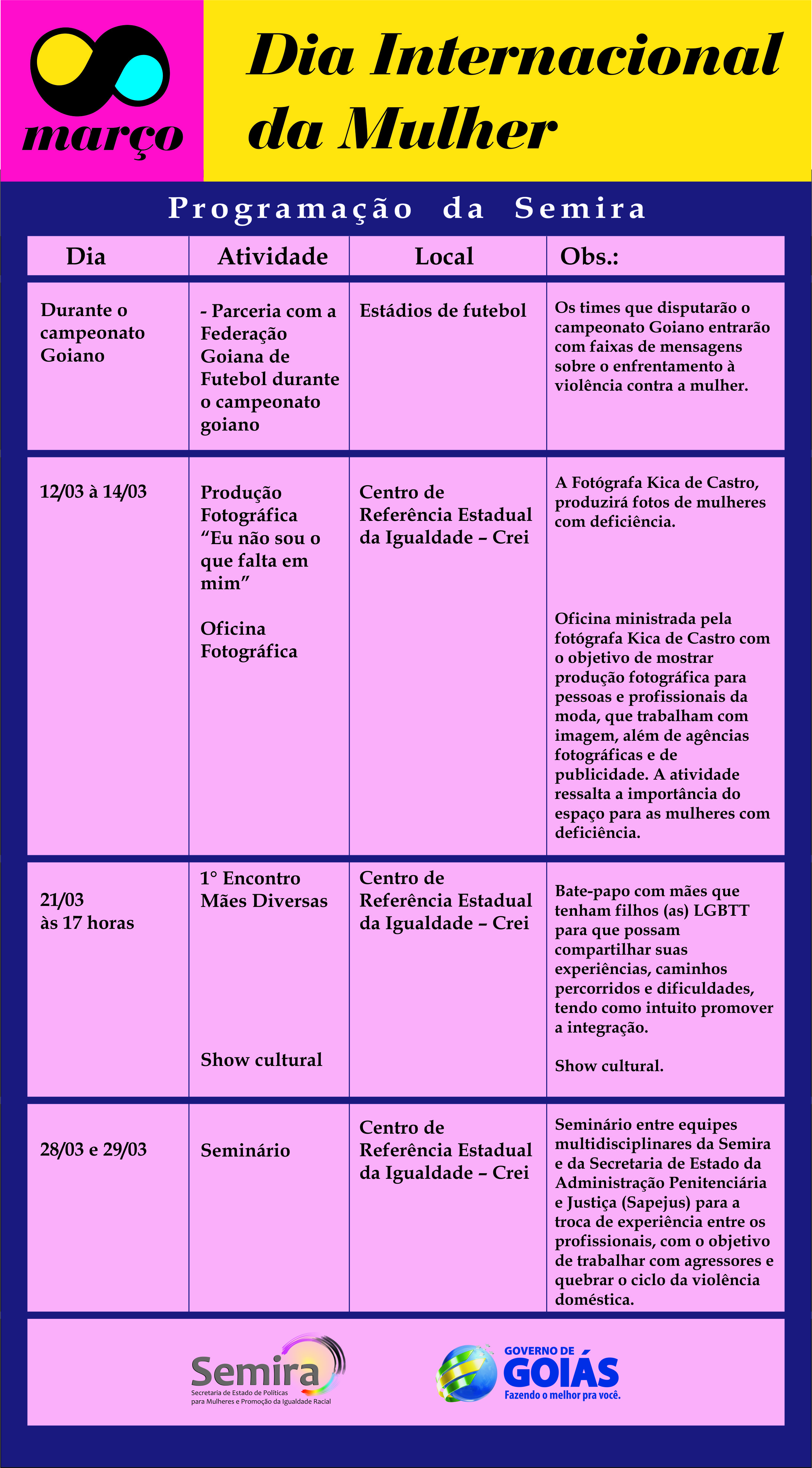 [Pactonacional] Programação da Secretaria de Políticas para Mulheres e Promoção da Igualdade Racial do Estado de Goiás