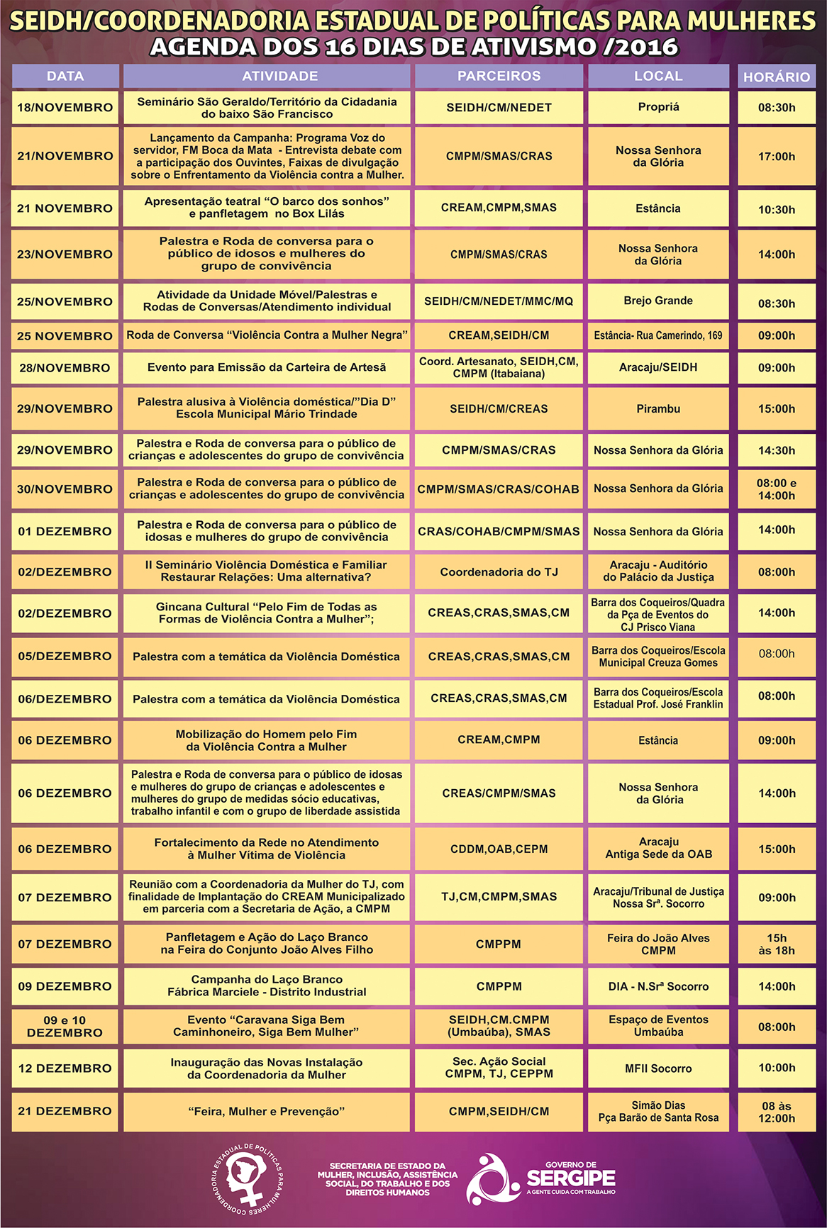 [Pactonacional] CALENDARIO DOS 16 DIAS DE ATIVISMO NO ENFRENTAMENTO A VIOLÊNCIA CONTRA A MULHER 2016 SERGIPE